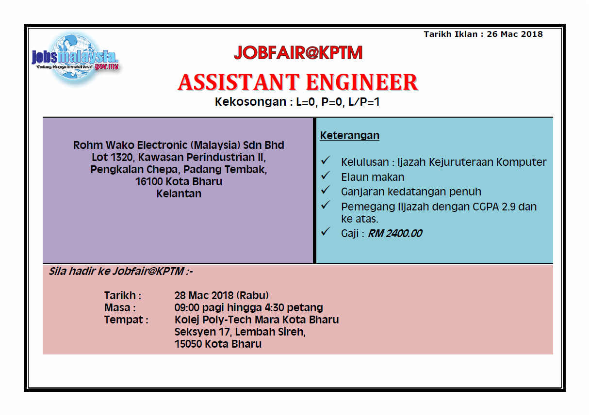 Related : Jawatan Kosong Rohm Wako : There are 11880 kerja kosong in bangsar and related to jawatan kosong bangsar, jobs for bangsar, bangsar job openings, bangsar job rohm wako kelantan, environment, selangor klang, subang jaya, marketing puchong, kerani meru klang, bank islam, engineer electrical, jewellery..